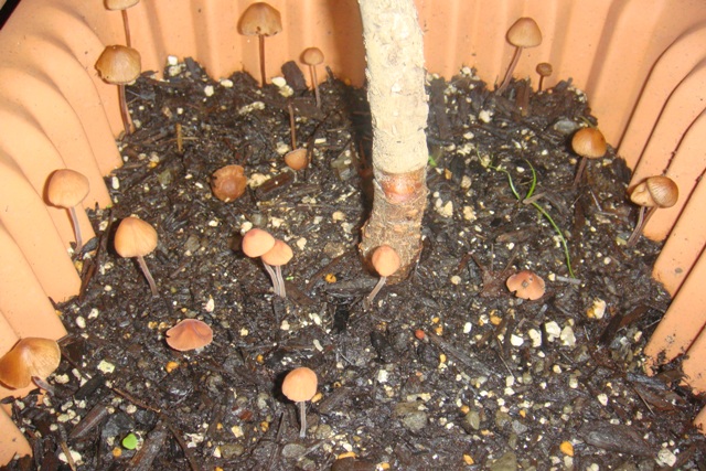 ふと、プルーンの鉢植えを見るとそこは再び「きのこの山」 (+_+)