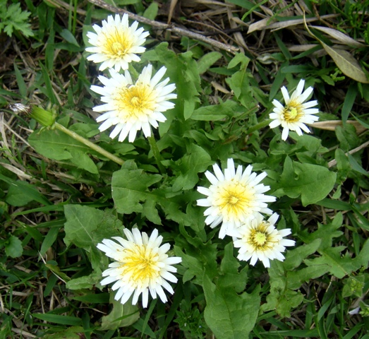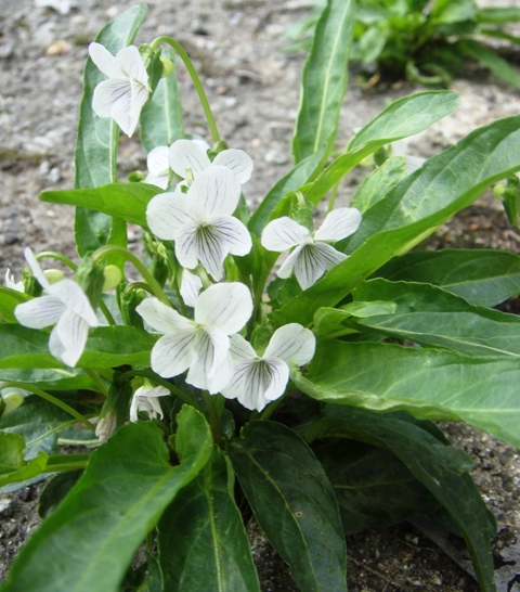 アスファルトを潜り抜け白い菫が群生。